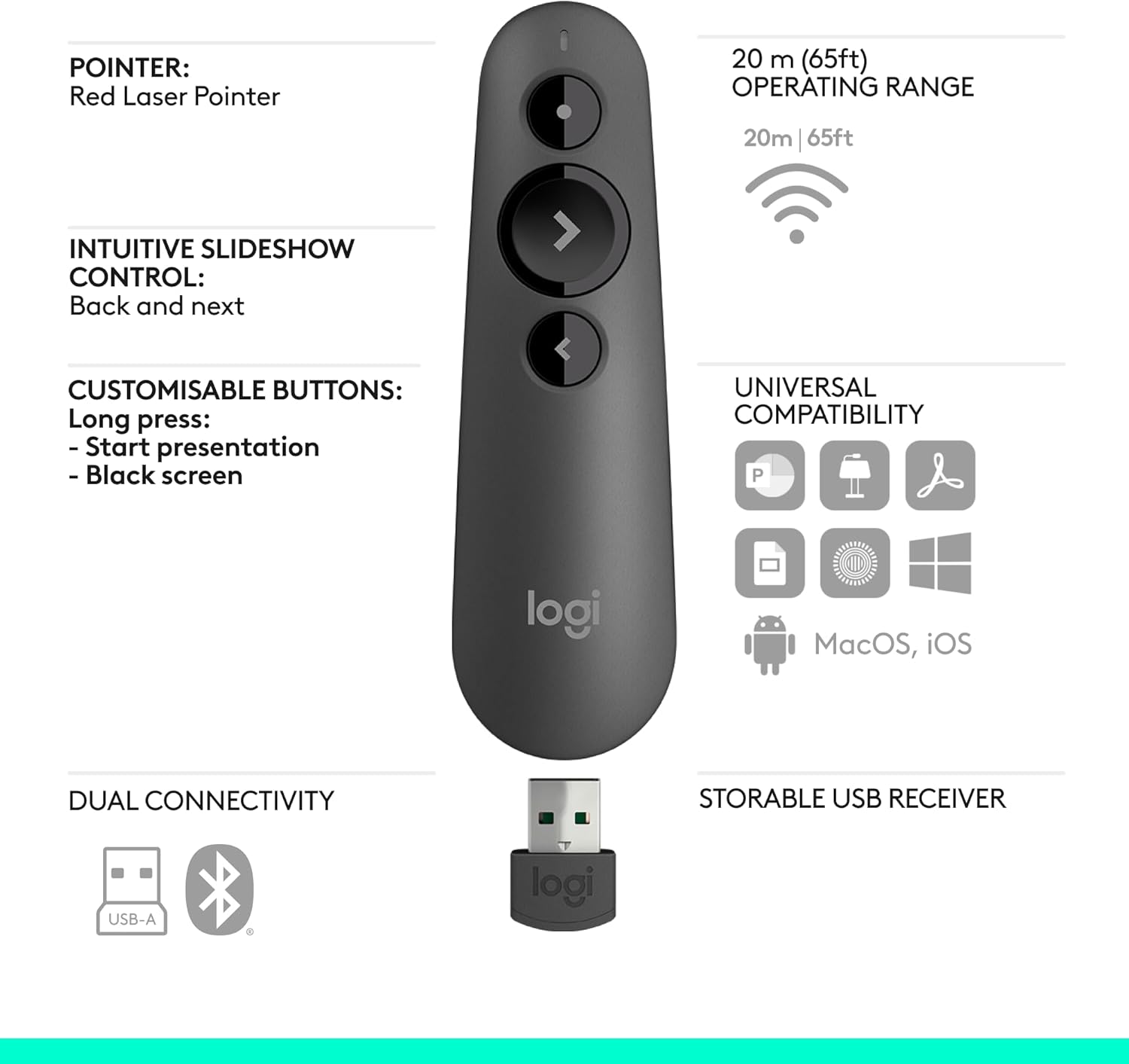 The Logitech R500s combines precise slide navigation, a high-visibility laser pointer, and reliable 2.4 GHz wireless connectivity. Plug-and-play USB setup means you’re ready to present within seconds — no software or drivers required. The forward and back buttons are intuitively placed for seamless slide control, and the built-in laser pointer helps draw your audience’s attention to key content on the screen.